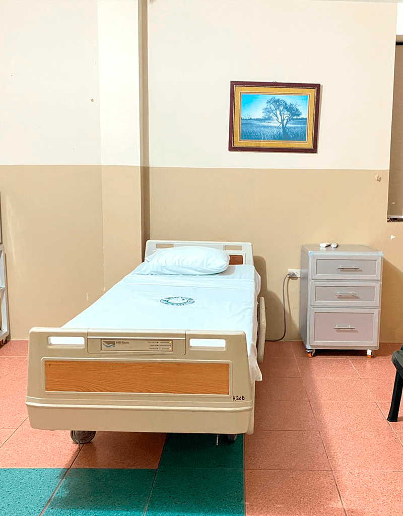 Las habitaciones todas individuales están distribuidas en dos pisos, cerca de ellas se ubican estratégicamente dos estaciones de enfermería con personal capacitado, para garantizar una adecuada atención al paciente